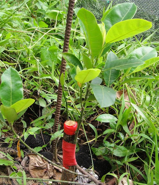 ⇢學習「高壓法」苗木繁殖(榴槤雖高壓成功長根,但移植後或1-2年後仍照顧到枯死;因此要種榴槤還是種榴槤實生苗-成本低,等苗株成活長壯,主幹約拇指大後,再嫁接,其成長得快速…)